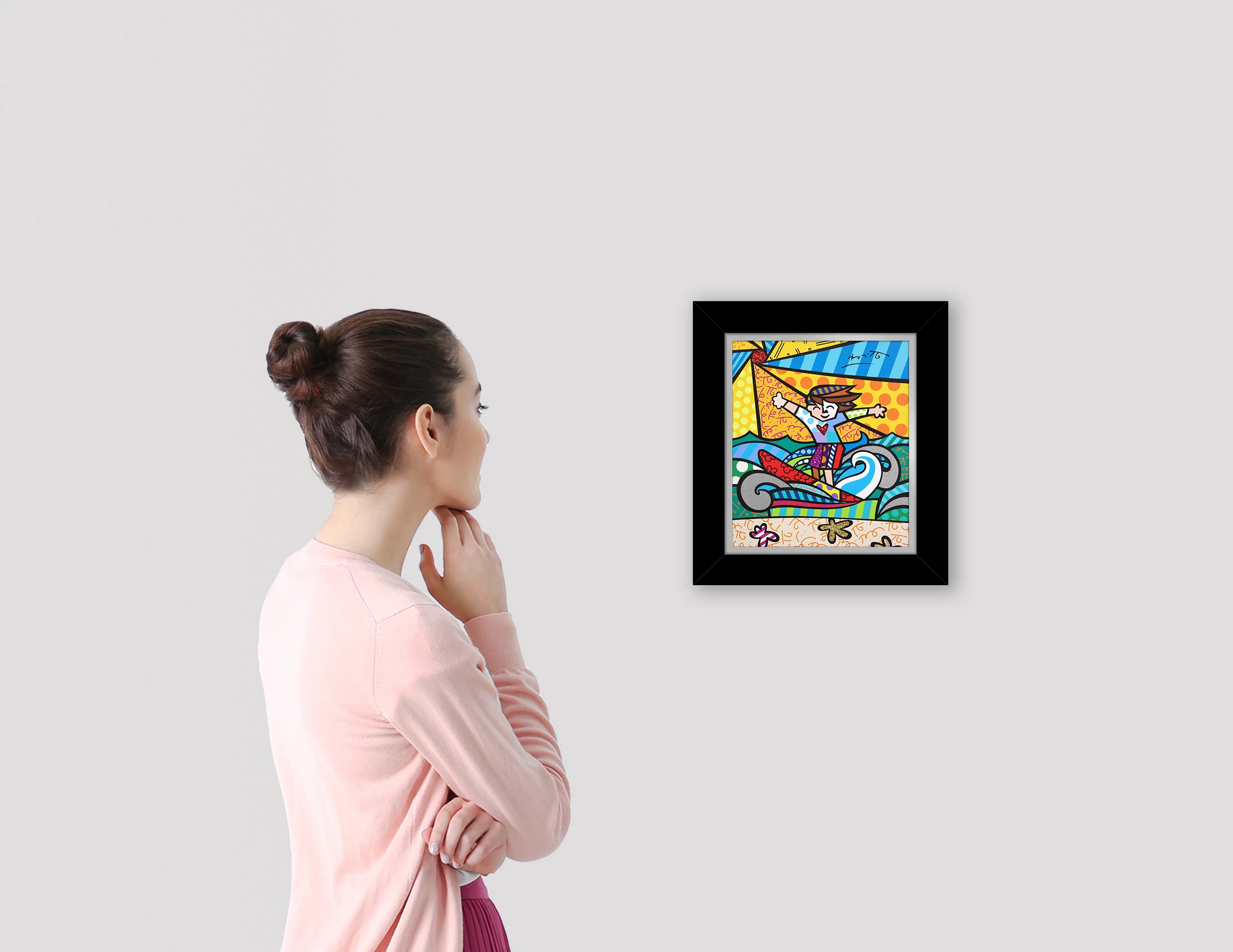 Surfer Boy captures the carefree spirit of youth and the joy of life by the sea. With vibrant colors, bold lines, and playful patterns, Romero Britto expresses movement, freedom, and optimism, while the diamond dust embellishments add a dynamic sparkle that brings this energetic composition to life.